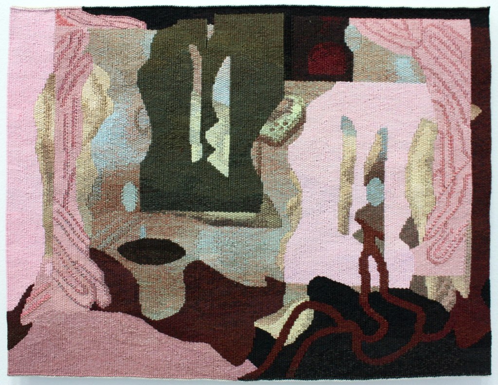 The collage Eternally folded has never been developed as a tapestry. It is the result of a longer period of collage work for the exhibition at Kunstnerforbundet. The elements of various images of materials turn into new and unknown lines which create an inner room framed with a contrasting pink. I can describe it as an inner landscape and a tactile memory.