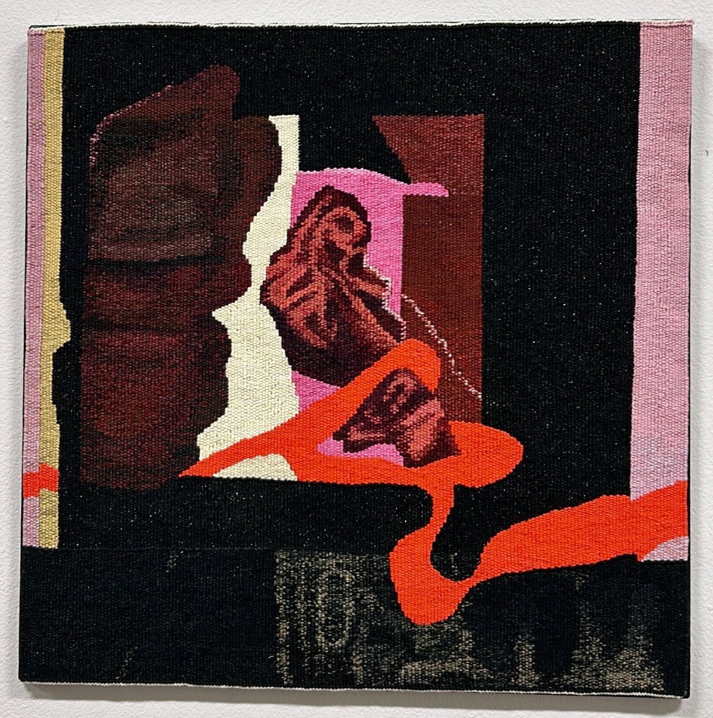 The tapestry Bånd II was part of an exhibition at Kunstnerforbundet in Oslo in 2022. The exhibition of tapestry work in larger and smaller scale were all connected in various combinations of pink and contrasting darker colors. I was playing with floating lines on top of the surface, based on the background of one of my old photographs, mostly present in the tapestry Bånd I that you can view on my website. The title Bånd in Norwegian has a dual meaning, bånd as in ribbon, and bånd as a connection between people.